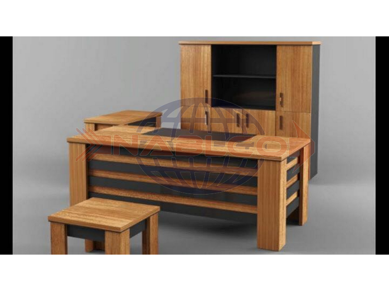 MDF Desk with Laminated veneer non scratchable, with legs (L) shape, and double color front, wooden side, 3 drawers unit, with size 160 & 180cm, and all colors